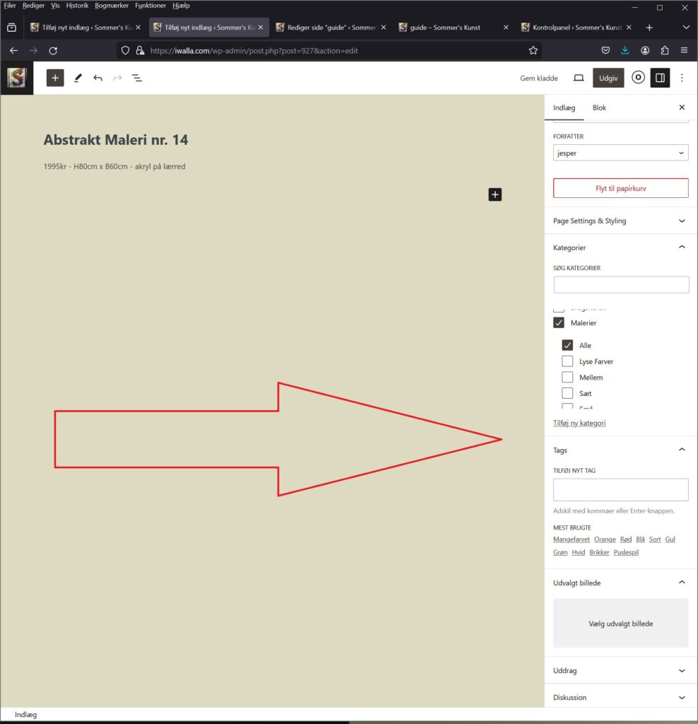 Vælg derefter kategorier og tags. kategorier skal du som udgangspunkt have mindst 3 af hvis det er malerier: MALERIER-ALLE-STØRRELSE. du kan godt vælge flere men minimum de 3.